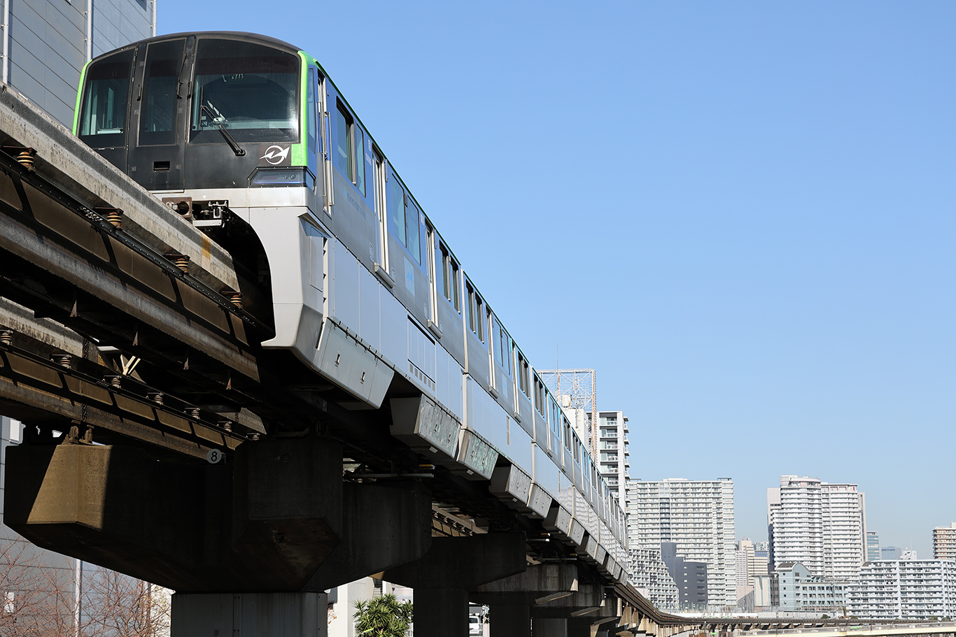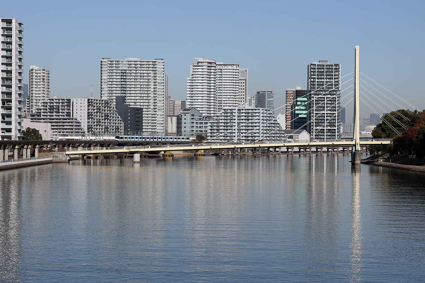 遠景でマンション群を走るモノレールと運河と言うイメージで